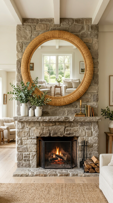 One giant round mirror above the mantel bounces light and makes the farmhouse room feel twice as big.