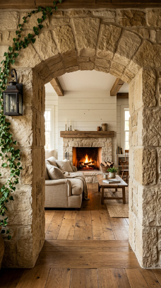 A stone arch leading into the living room frames the space like a painting every single time.