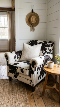 One bold black and white cow print accent chair in the corner is farmhouse fun done right.