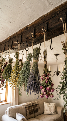 Bundles of drying herbs hanging from the ceiling beam add fragrance and farmhouse soul.