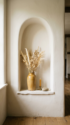 A plastered arch alcove carved into the wall becomes the most beautiful farmhouse display shelf.