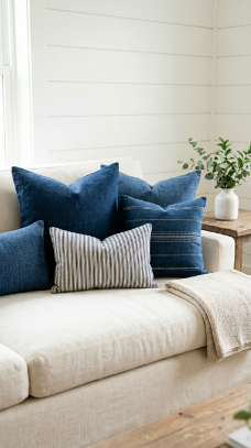 Deep indigo blue throw pillows against a cream sofa create a crisp, striking farmhouse moment.