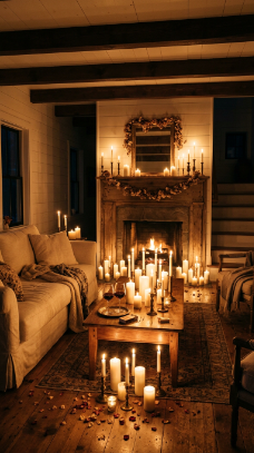 Dozens of flickering candles at varied heights transform the farmhouse living room at night.