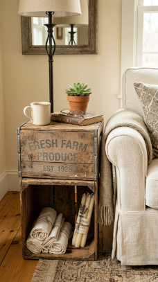 Stacked vintage wooden crates repurposed as side tables are farmhouse styling at its most clever.