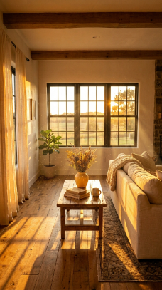 When the late afternoon sun floods the farmhouse living room โ€” everything becomes golden perfection.