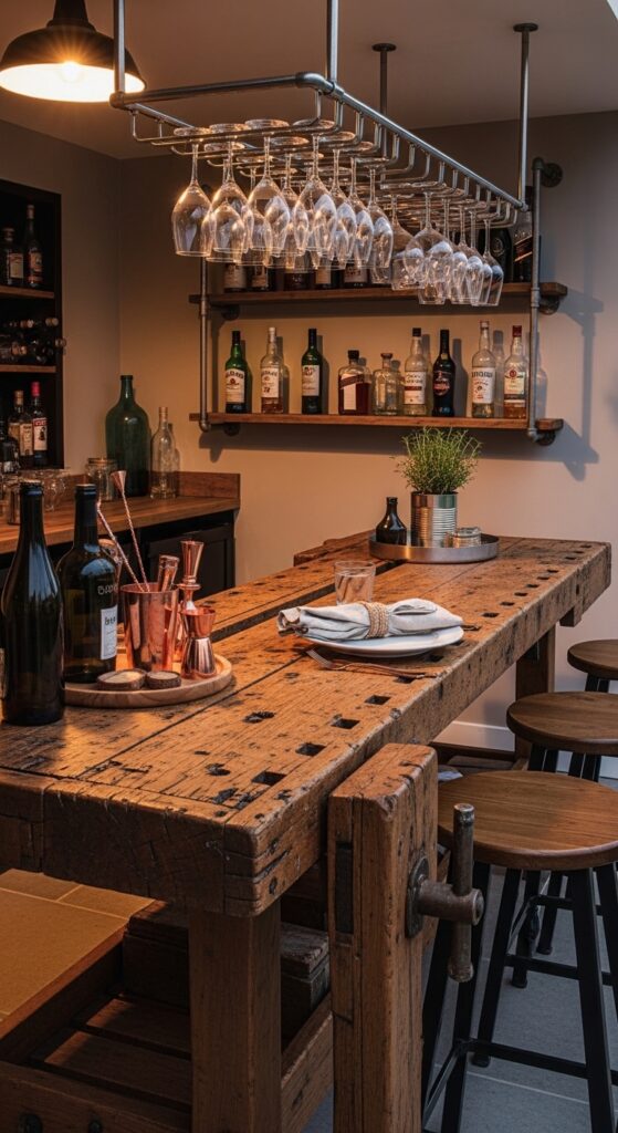 How to achieve it: Source reclaimed elm, oak, or pine workbench tops from architectural salvage yards — budget £80–200 for a good 1.8m length. Sand lightly and seal with a food-safe hardwax oil rather than varnish, preserving the texture. Add a simple stemware rack above using stainless steel wire-hanging systems.