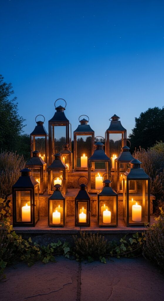 How to achieve it: Use battery-operated LED candles with warm flicker settings (2700K or below) inside lanterns for safety and longevity. Source antique lanterns from eBay or Etsy, or look for weathered reproductions at garden centres in the £15–40 range.