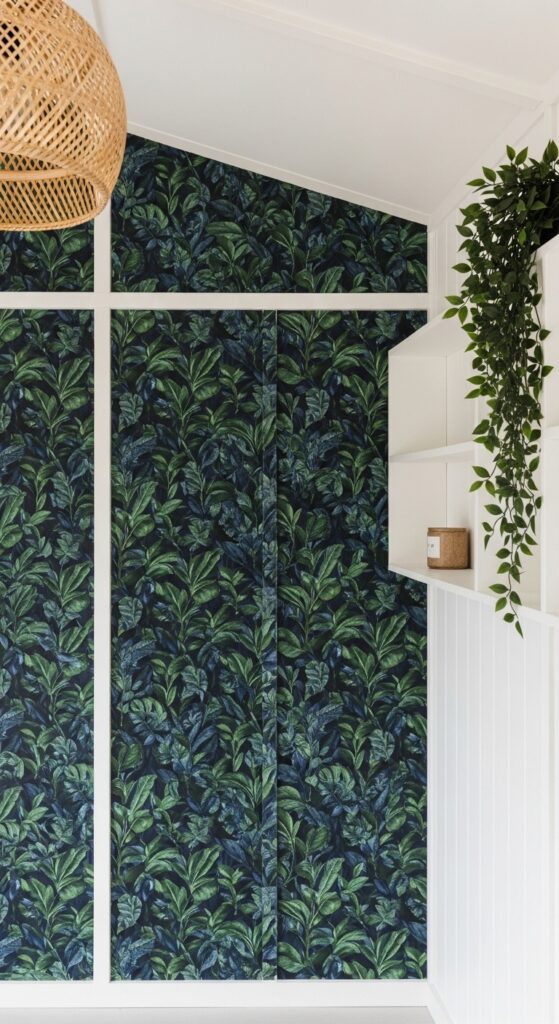 Vibe sentence: One wall of botanical wallpaper turns a plain summer house into a room you genuinely want to spend time in.