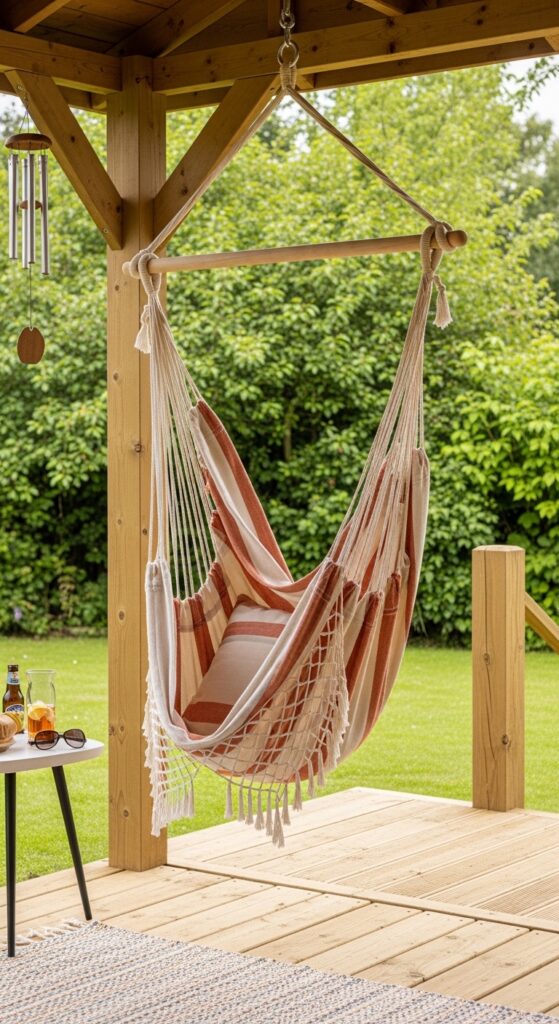 How to achieve it: Specify M10 stainless steel eye bolts set into structural posts at a height of approximately 1.5m for a comfortable hang angle. A hand-woven Nicaraguan or Brazilian cotton hammock (widely available from £40–90) is more comfortable and more beautiful than synthetic alternatives.