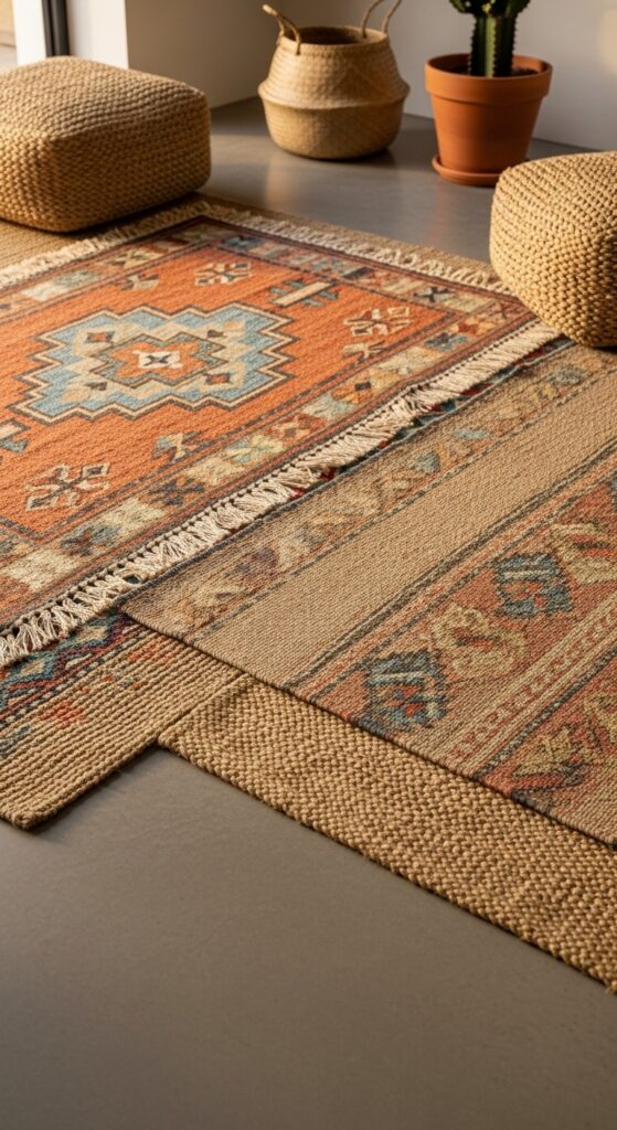 What makes it work: The pairing of a cool, smooth concrete base with warm, textured rugs creates the tactile contrast that makes a room feel designed. Layering — a large jute base rug under a smaller kilim — adds a relaxed, collected quality that single rugs rarely achieve.