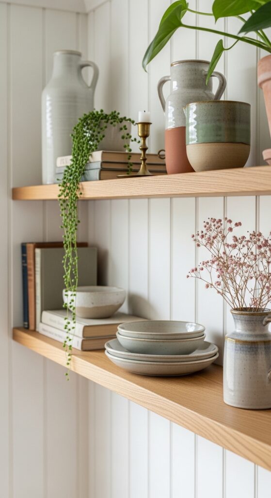 What makes it work: The combination of organic ceramics, natural materials, and living plants creates a shelf display that feels curated and personal rather than staged. Varying the height of objects — tall vessels at back, low dishes at front, trailing plants breaking the shelf line — creates a composition with genuine visual rhythm.