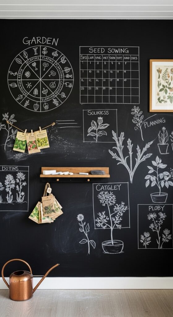 What makes it work: Chalkboard paint on a full wall creates a functional centrepiece that earns its place in any garden retreat used for planning, journalling, or children’s play. The contrast of matte black with white chalk marks is graphically striking and immediately characterful.