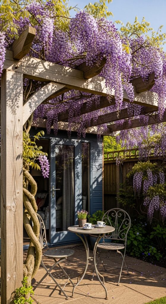 Vibe sentence: A wisteria pergola creates an outdoor room before you’ve even stepped inside — entirely unforgettable.
