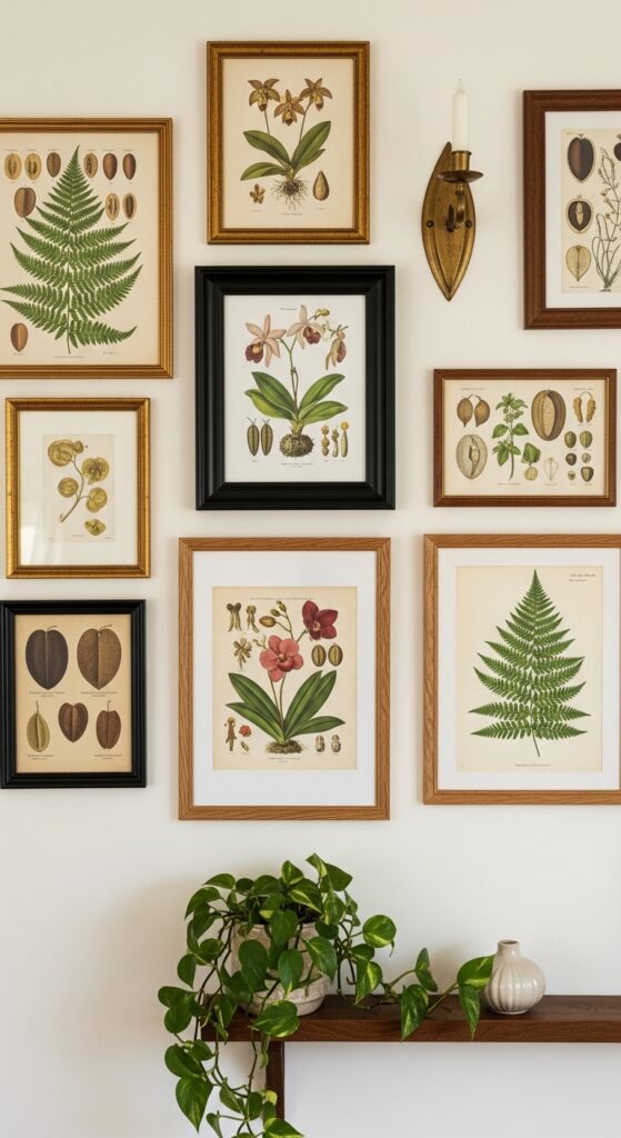 How to achieve it: Source vintage botanical prints from Etsy, antique markets, or free print archives such as the Biodiversity Heritage Library (biodiversitylibrary.org). Frame in a mix of charity shop finds spray-painted in complementary tones — all in gold, all in black, or all in natural timber.