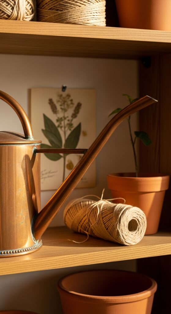 How to achieve it: Look for traditional long-reach copper cans from Haws (the British manufacturer, established 1886) or similar specialist suppliers. A genuine copper can costs £60–120 but outlasts plastic alternatives by decades. Position on open timber shelving at approximately eye height where the light can catch the patinated surface.