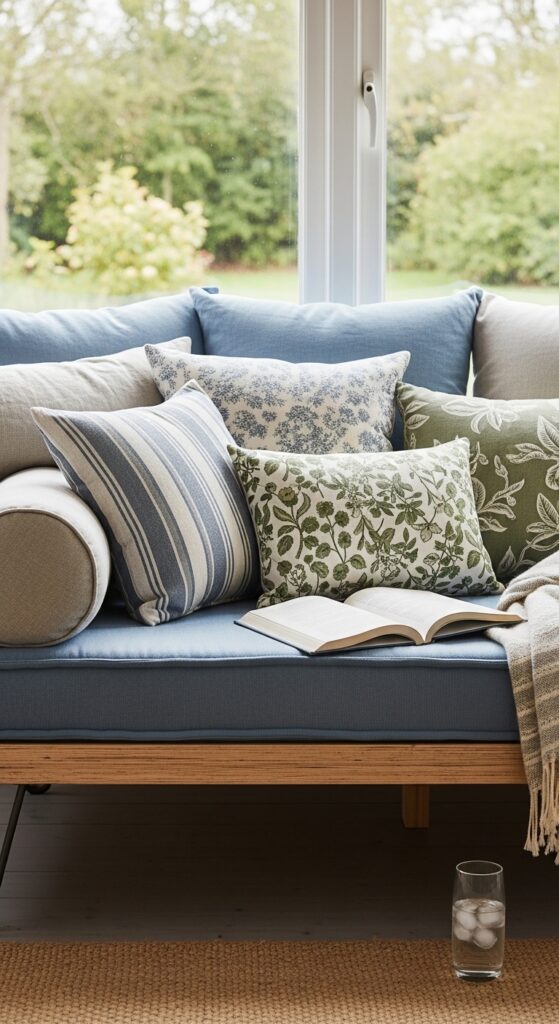 What makes it work: Width is everything — a daybed that’s at least 90cm wide reads as genuinely generous rather than an afterthought. Layering cushions in varying sizes and slightly mismatched patterns (tied by a shared colour palette) creates the effortless abundance that makes the space feel like you’re meant to actually use it.