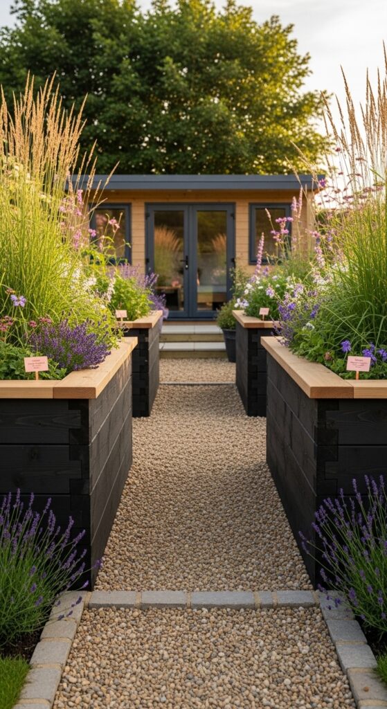 What makes it work: Matching beds create symmetry and a sense of intentional design that instantly elevates the overall garden scheme. Planting at varying heights — low lavender at front, tall grasses behind — gives the beds depth and movement across the season.