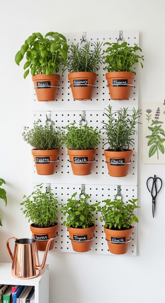 How to achieve it: Use 90mm terracotta pots fitted with clip-on hanging frames designed for pegboard (available from garden centres and online). Position the board within 1.5m of a natural light source — a south-facing window is ideal. Herbs requiring most sun (basil, rosemary, thyme) go at the top nearest maximum light.