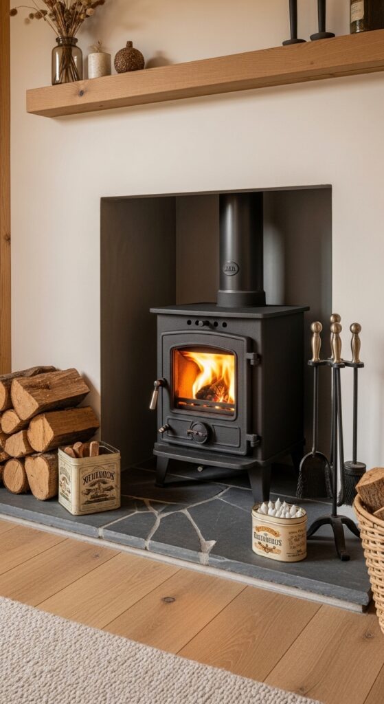 What makes it work: A small 3–5kW output stove is scaled perfectly for garden room dimensions of 20–40m², heating the space efficiently without overwhelming it. The visual focus of a stove — the dancing flame, the cast iron detail — creates a focal point the room organises itself around, even when unlit.
