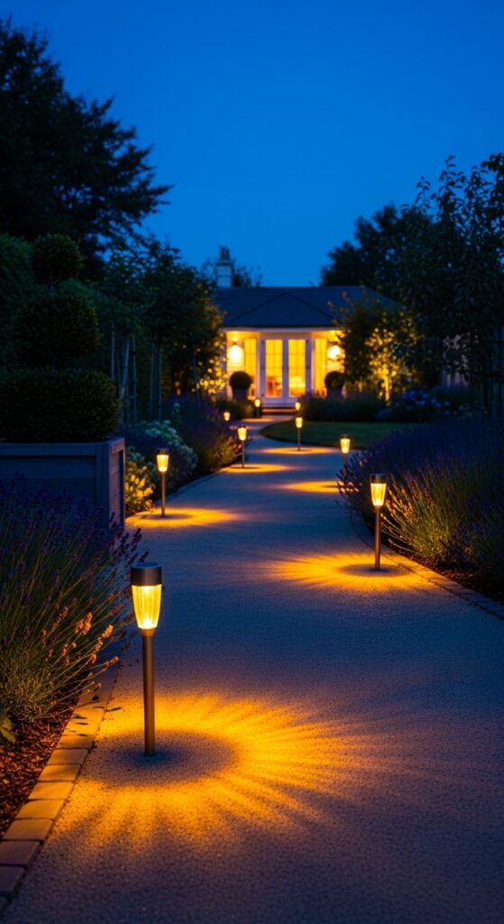 What makes it work: Consistent stake light spacing (typically 60–90cm apart) creates a rhythm that draws the eye along the path and toward the destination. Bronze or aged steel finishes read as architectural rather than ornamental, elevating the overall scheme.