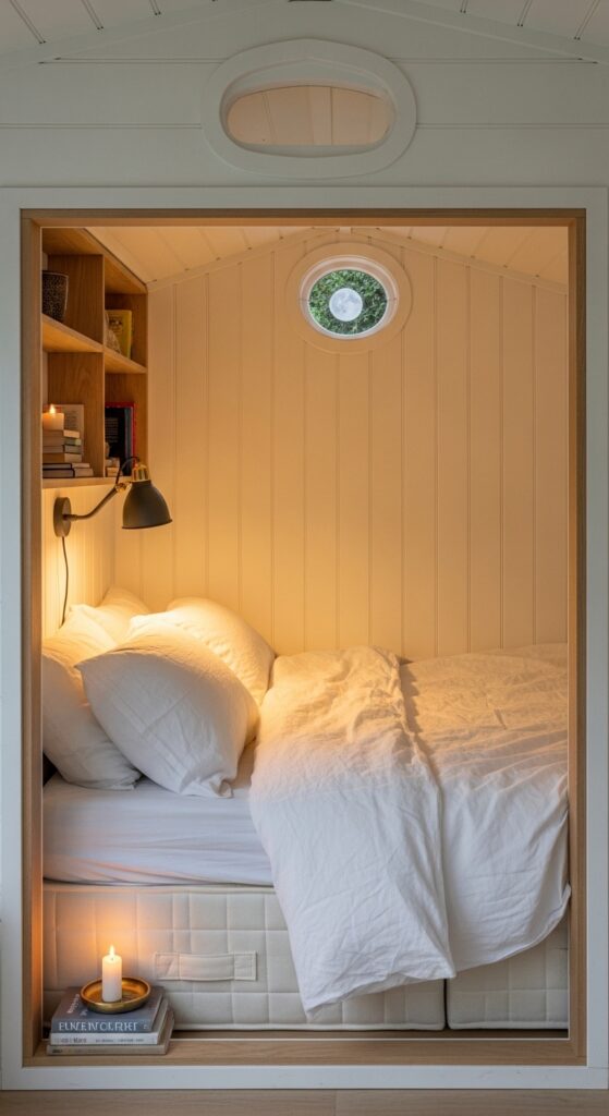 What makes it work: Enclosing the sleeping area within a built-in alcove creates a sense of cocooned privacy that freestanding beds rarely achieve. The integrated shelving on either side makes the bed feel designed-in rather than placed, and the beadboard panelling adds texture that a plain wall never could.
