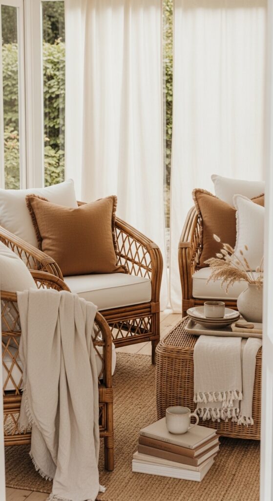 What makes it work: Rattan’s organic texture adds warmth and visual interest without heaviness — it reads as relaxed but never cheap when paired with high-quality natural textiles. The tonal palette of warm neutrals creates a cohesive, restful space that doesn’t compete with the garden view outside.