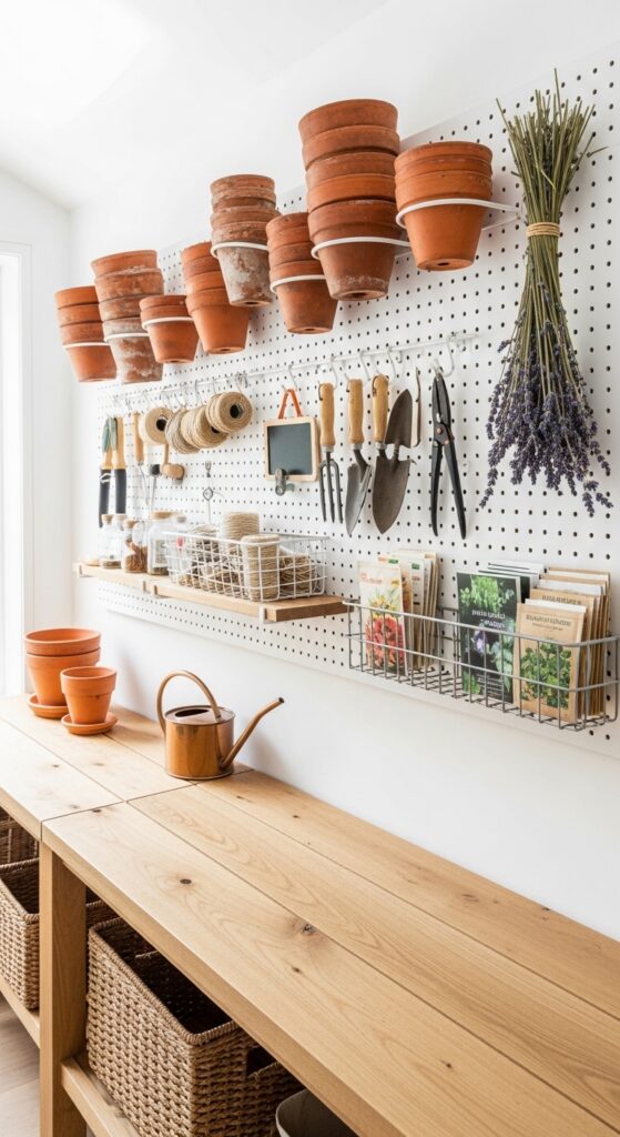 What makes it work: Pegboard is endlessly reconfigurable — hooks, shelves, and baskets can shift with the seasons — while keeping everything visible and accessible. Painting it white makes the colourful tools and terracotta pots pop against it, turning pure function into a display.