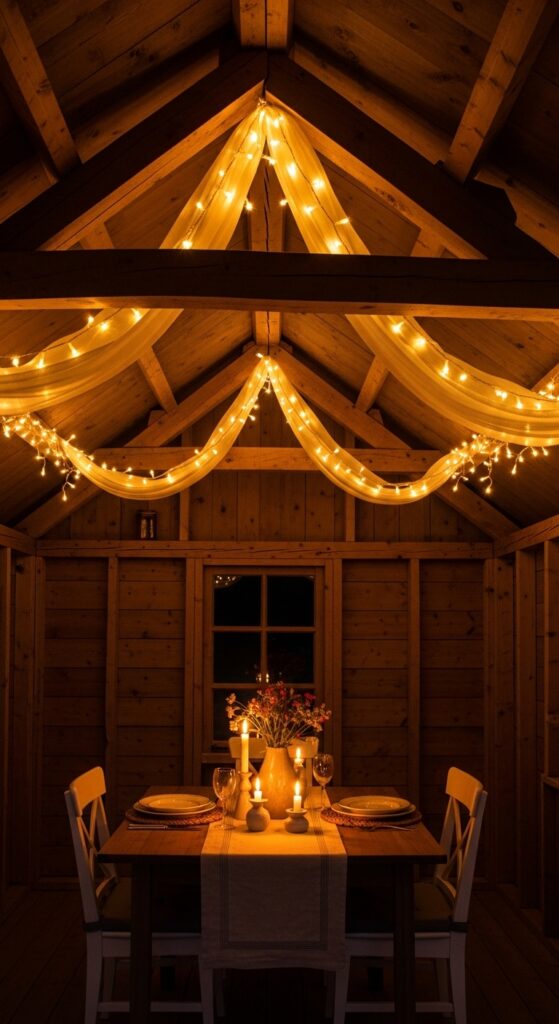 How to achieve it: Choose warm white (2200K–2700K) bulbs with visible filaments for an Edison effect. Drape lights loosely on large cup hooks screwed into the rafter undersides, with swags no more than 40cm deep. Run all lights to a single timer socket so the atmosphere arrives automatically every evening.
