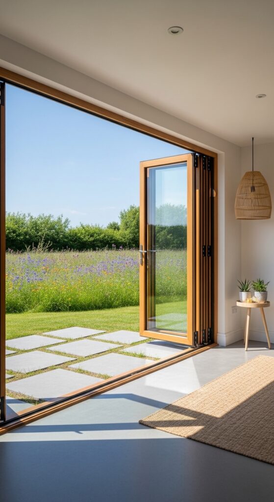 How to achieve it: Specify slim-profile aluminium-clad timber bifolds in a bronze or dark grey finish to minimise visual frame bulk. A single continuous threshold strip (rather than a step) makes the flow between surfaces feel architectural rather than makeshift.