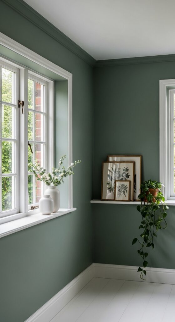 What makes it work: The deep, muted green draws the eye inward while simultaneously referencing the garden outside, creating a sense of immersion in the landscape. White trim provides the necessary contrast that keeps the space feeling crisp rather than cave-like.