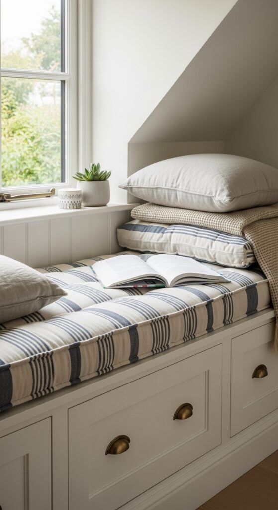 Vibe sentence: A window seat in the eaves is the adult version of a childhood hiding place — and just as perfect.