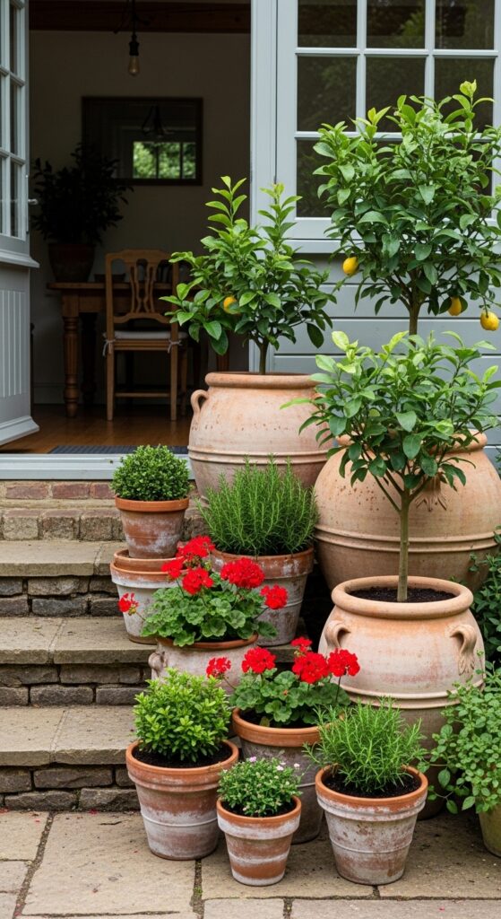 What makes it work: Grouping in odd numbers (3, 5, or 7 pots) and varying heights by at least 15–20cm between each creates a composition with rhythm and visual movement. The aged patina of terracotta adds immediate warmth that plastic or glazed pots simply cannot replicate.