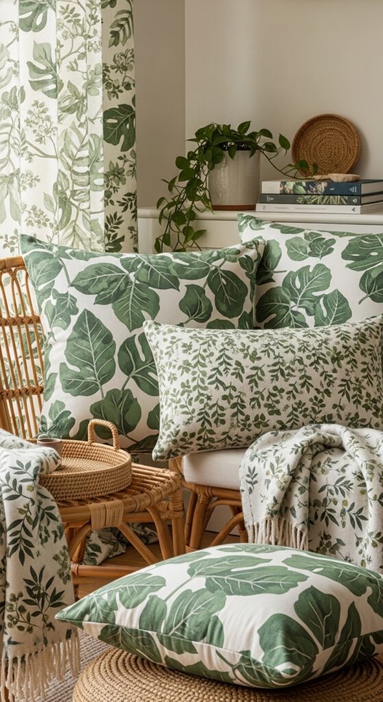 How to achieve it: Layer two scales of botanical print — a large-leaf pattern on cushions and a smaller sprig print on a throw — for depth. Stick to a tonal palette (all greens, or green and cream) rather than multicolor to keep the room feeling calm rather than busy.