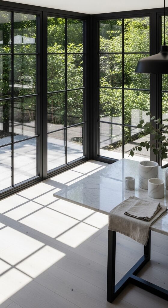 How to achieve it: For new construction, specify black-painted aluminum windows with thermally broken frames. For a budget-friendly conversion, apply Rust-Oleum Satin Black spray paint to existing white aluminum window frames — it’s durable, affordable, and dramatically changes the room’s aesthetic.