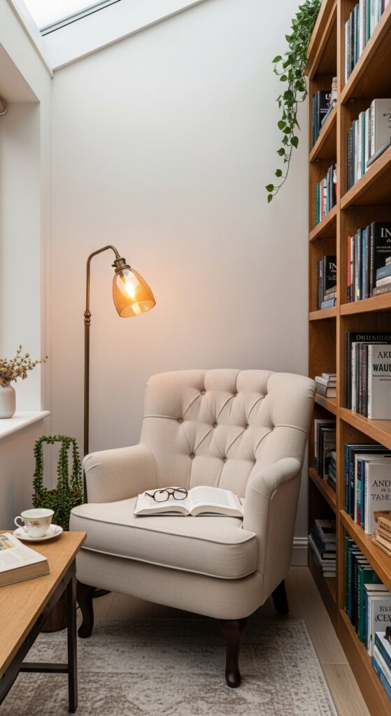 How to achieve it: A single beautiful armchair positioned to face the garden is the anchor. Add a floor lamp for cloudy days and evenings, a small side table, and built-in or freestanding bookshelves on any solid interior wall. Keep the footprint intentionally small — this room should feel like a retreat, not a library.