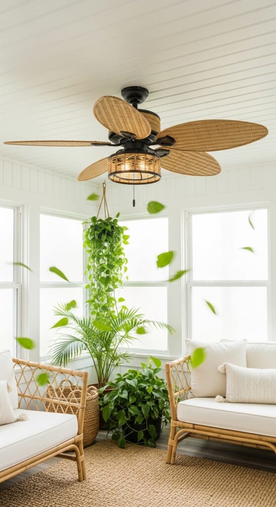 What makes it work: A ceiling fan with natural material blades serves both function and aesthetics in a sunroom. The air circulation reduces heat buildup on sunny days — a real practical need — while the rattan or bamboo material reinforces the natural indoor-outdoor design language of the space.