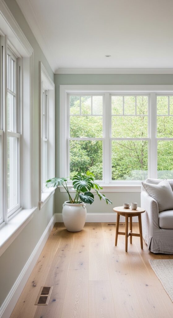 💡 Sage green pairs with nearly every wood tone and metallic, making it one of the most versatile sunroom wall colors.