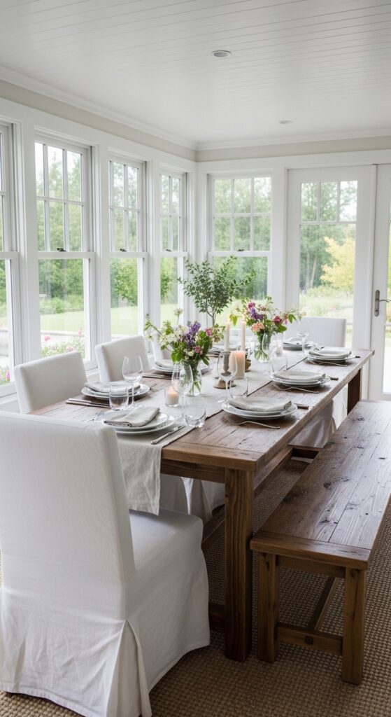 What makes it work: Placing a dining table in a sunroom is one of the most compelling uses of the space because it turns every meal into an experience — light changes, the garden shifts, and the room itself becomes part of the occasion. A long harvest table maximizes the communal feeling.