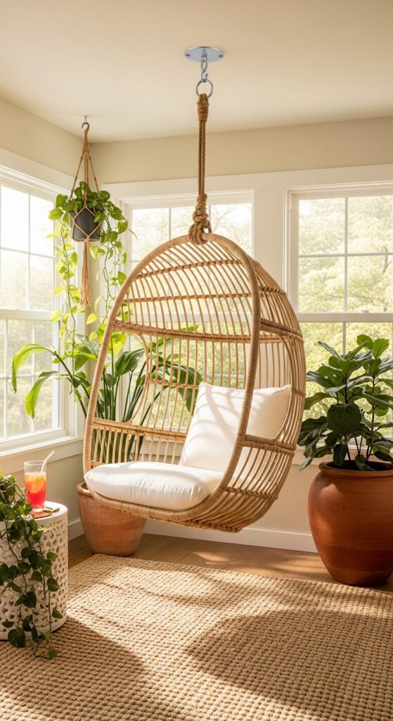 What makes it work: A hanging chair uses vertical space rather than floor space — critical in smaller sunrooms — and its suspension creates gentle movement that amplifies the sunroom’s breezy, outdoor character. It also signals something about how the room is meant to be used: slowly.