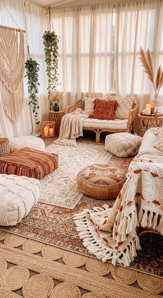 How to achieve it: Start with a large natural jute base rug, then layer a smaller, patterned rug on top. Add a macramé wall hanging on the one solid interior wall. Use warm cream, terracotta, and dusty rose tones to keep the layering cohesive rather than chaotic.