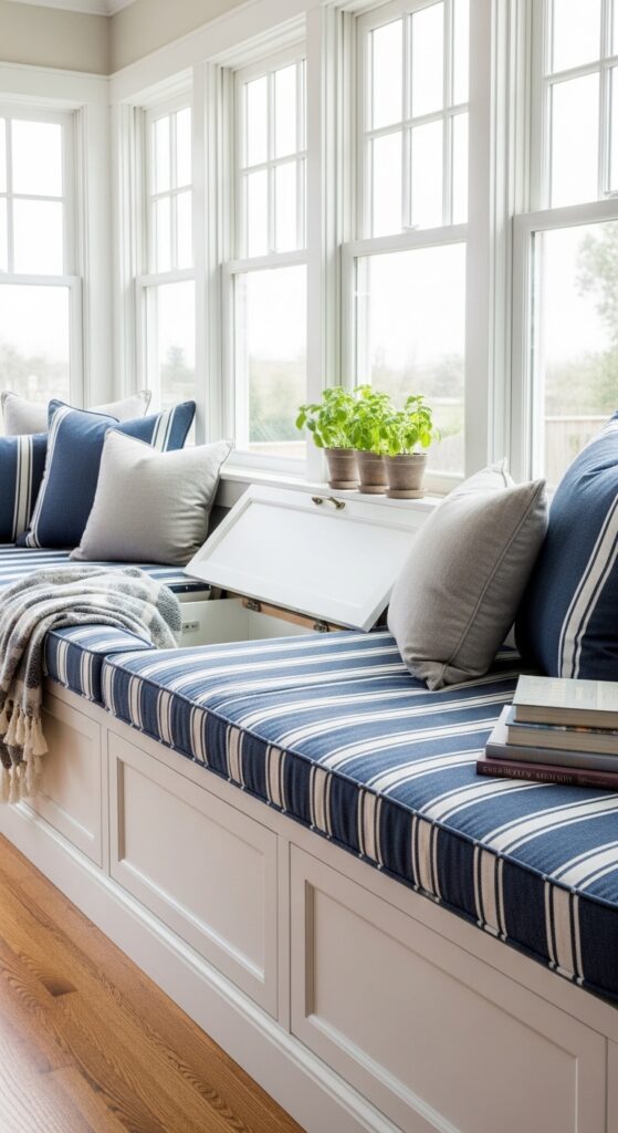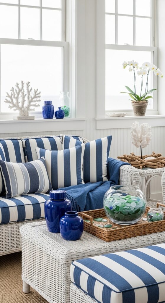How to achieve it: Commit fully to the stripe — navy and white ticking fabric on cushions, throws, and even a small bench cushion creates a cohesive, deliberate coastal look. Add sea glass collected from actual beaches or purchased in bulk for an organic, personal touch on windowsills and trays.