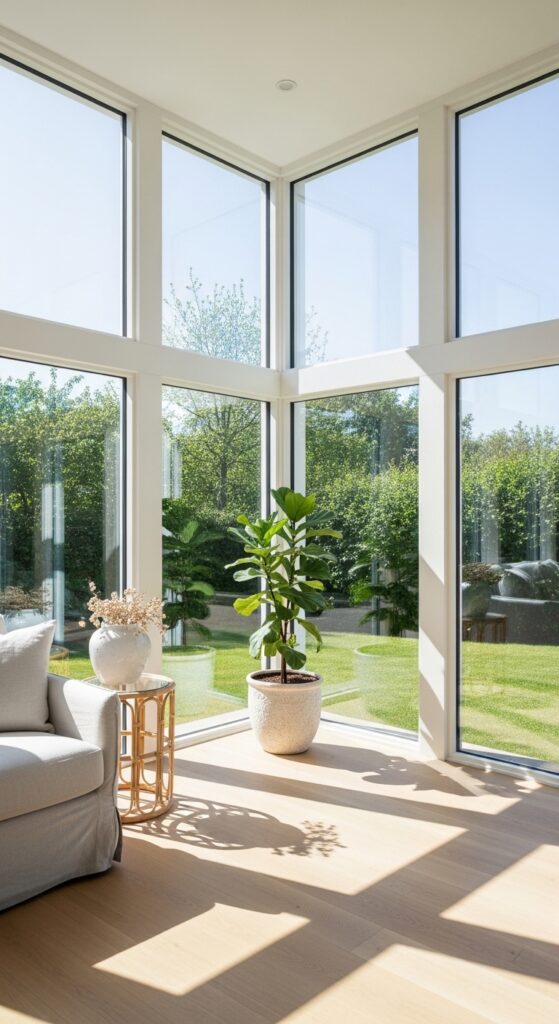 How to achieve it: If replacing windows, specify casement or fixed-pane windows with thermally broken aluminum frames in white or black — these offer the slimmest profile available. For existing windows, simply removing heavy curtains and valances immediately opens the room by 30 percent visually.