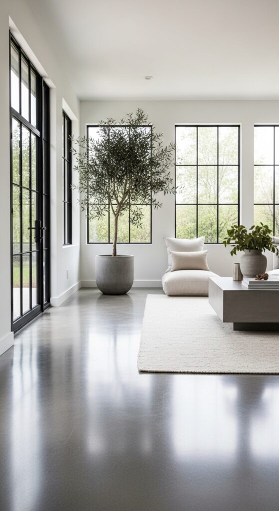 How to achieve it: Existing concrete slabs can be polished and sealed for $2–$5 per square foot by a concrete finishing contractor. If pouring new, specify a sealed, polished finish. Add a large wool or cotton rug to soften acoustics and provide underfoot comfort in seating zones.