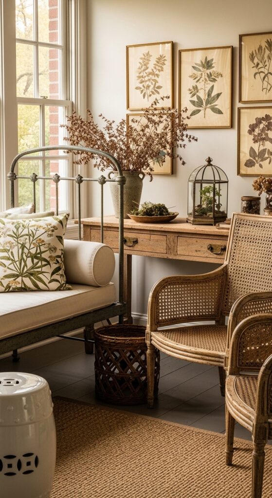 What makes it work: Vintage and antique pieces bring a patina and material depth that new furniture simply cannot replicate. In a sunroom, where the goal is to feel connected to something natural and unhurried, aged rattan, weathered iron, and worn wood communicate that value eloquently.