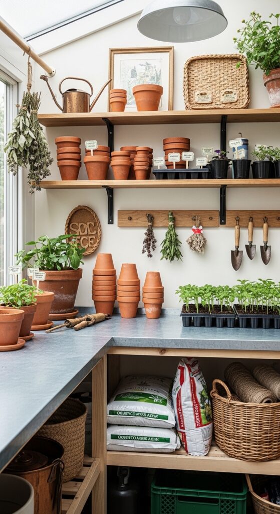 What makes it work: For plant lovers, a dedicated potting station makes a sunroom both more functional and more visually interesting. Open shelving with organized terracotta pots, a zinc or stone work surface, and styled garden tools creates a “beautiful utility” aesthetic that’s genuinely Pinterest-worthy.