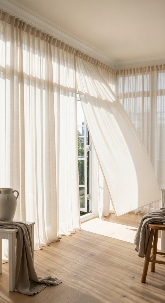 What makes it work: Floor-to-ceiling sheer linen panels hung at ceiling height perform a visual magic trick: they make windows look taller than they are and filter sunlight into something even more beautiful than direct light — warm, diffused, and flattering to everything in the room.