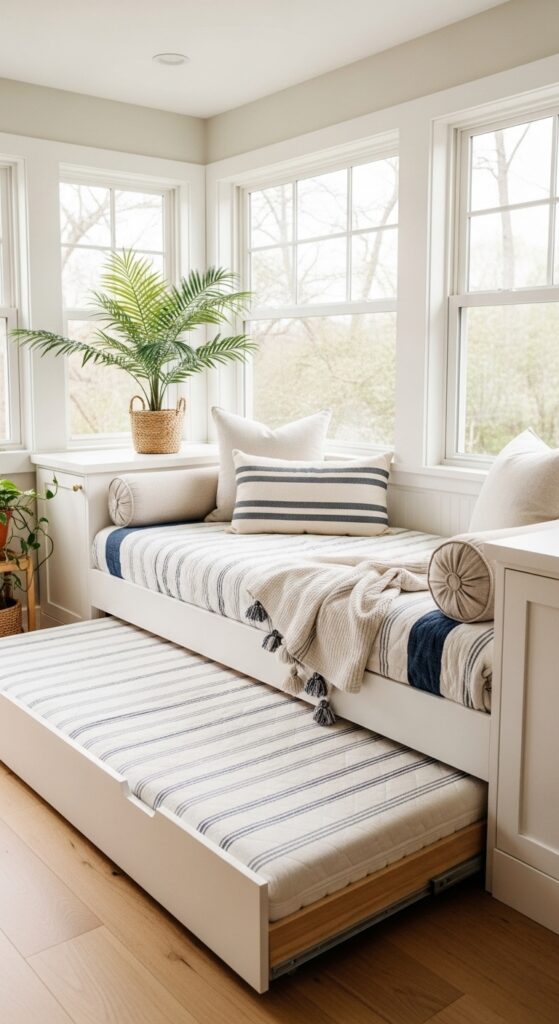 What makes it work: A built-in daybed with a trundle gives a sunroom genuine overnight hosting capability without the visual weight of a formal bed. During the day, styled with bolster pillows and a throw, it reads as a lounge. At night, pulled out and made up, it becomes a genuinely comfortable guest accommodation with spectacular morning light.