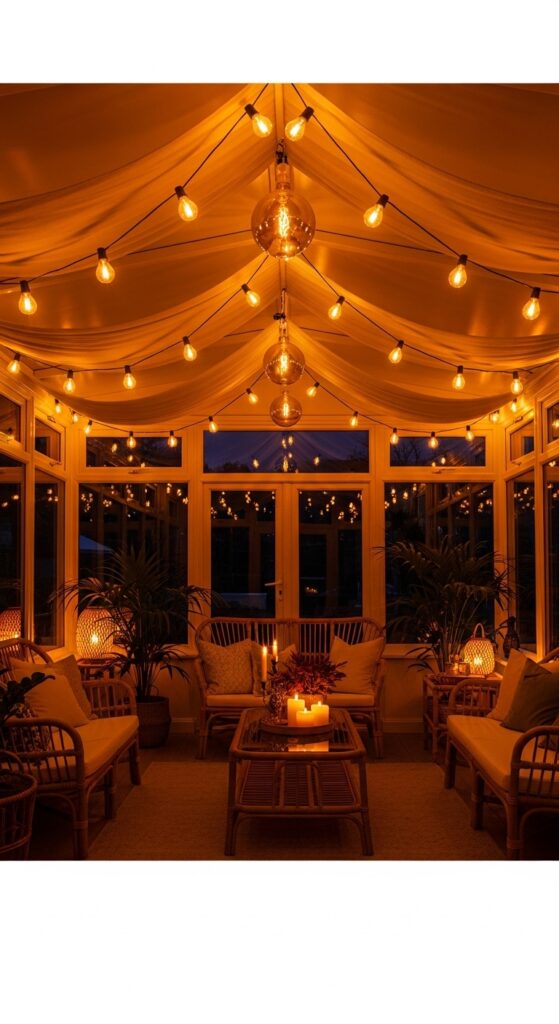 Vibe: After the sun goes down, this sunroom transforms into something genuinely magical — warm, glowing, and impossibly romantic.