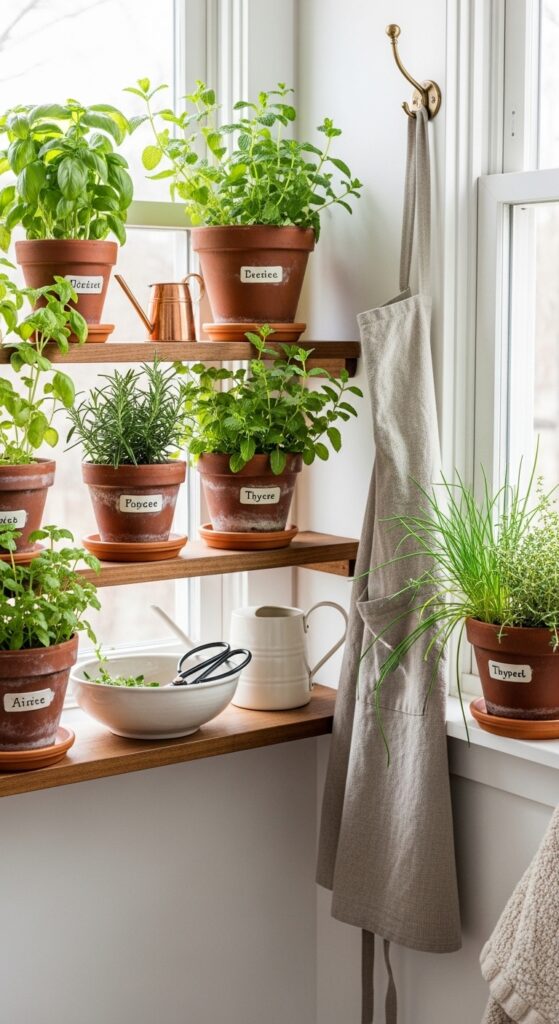How to achieve it: Install a three-tier wooden shelf in your brightest window. Plant basil, mint, rosemary, thyme, and chives in terracotta pots — these five cover most everyday cooking needs. Label with handwritten ceramic plant markers for a finished, intentional look.