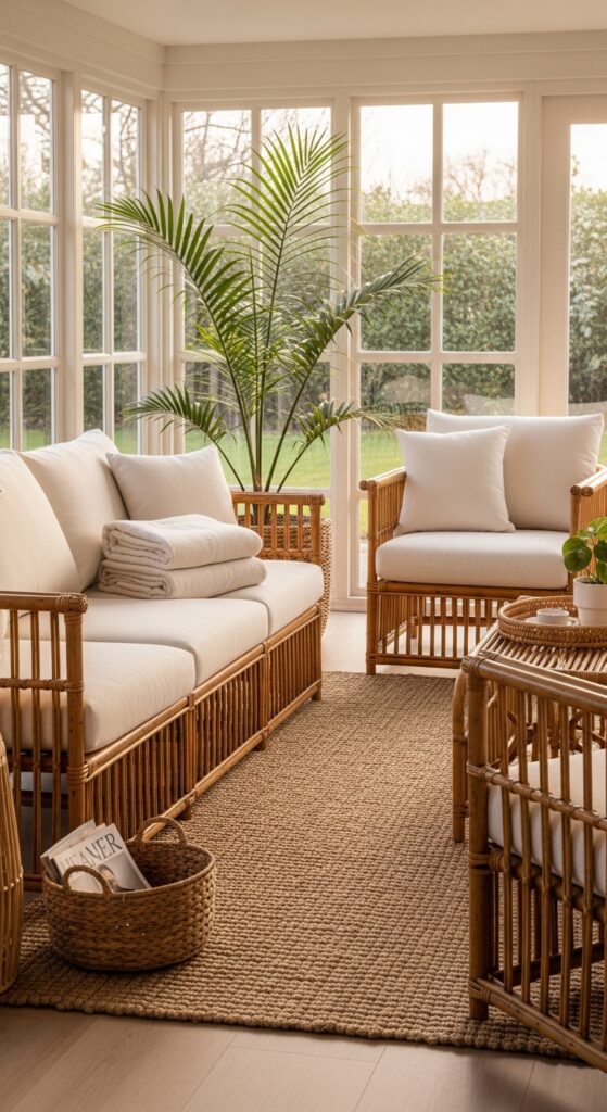 From there, the easiest entry point is furniture. Rattan or wicker seating is widely available at accessible price points, and one or two well-chosen natural fiber pieces will immediately shift the room’s energy. Resist the urge to replicate your indoor living room — sunrooms need breathing room and organic materials.